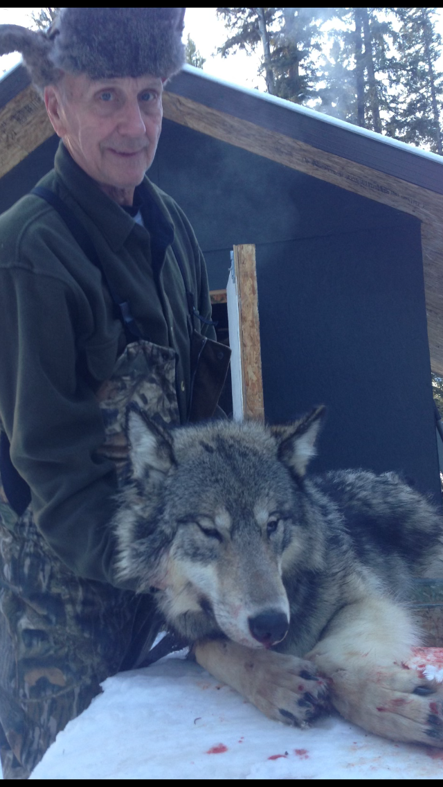 Our Wolf Hunts run 7 days beginning on December 6 through to March 7. The wolf hunts are a baited hunt from heated blinds with no limits on kills (coyotes included). Our remote camp is located between the Brazeau and the Elk river overlooking a lake. We take 2 hunters per week on our wolf hunts, which has kept our success rates fairly high at 80%.